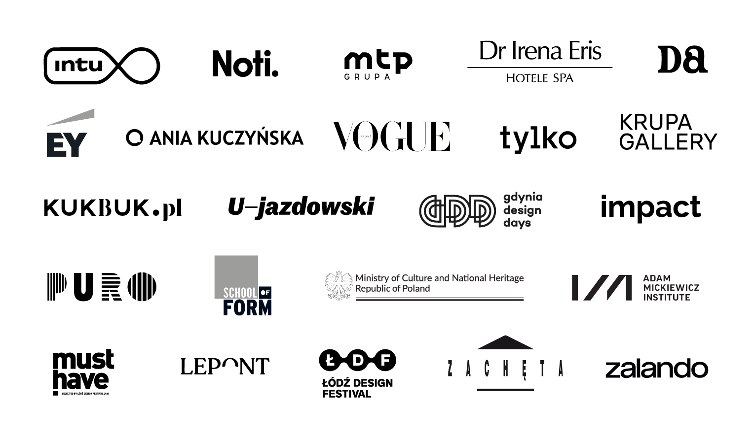 We collaborate with leading polish cultural institutions, such as Ujazdowski Castle - Centre for Contemporary Art, Adam Mickiewicz Institute, Zachęta National Gallery, KRUPA Art Gallery, Łódź Design Festival. Our clients involve multiple brands, agencies and institutions: Vogue Polska, PURO Hotels, Zalando, KUKBUK, Ania Kuczyńska, INTU showroom, Dr Irena Eris Hotels Spa, Impact CEE, Poznań Intenational Fair (MTP), School of Form, EY Polska, The Way event agency, Le Pont, NOTI.