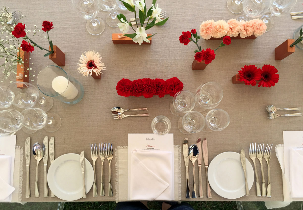 20 meters of tablecloth was hand made by us with a „flour batik” technique to obtain the marble stone effect. The scenography was completed with fern chandeliers hanging from the ceiling construction.