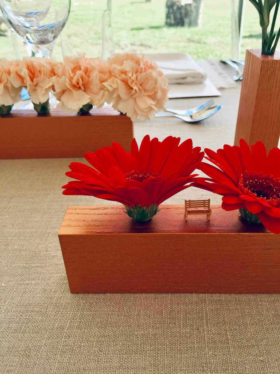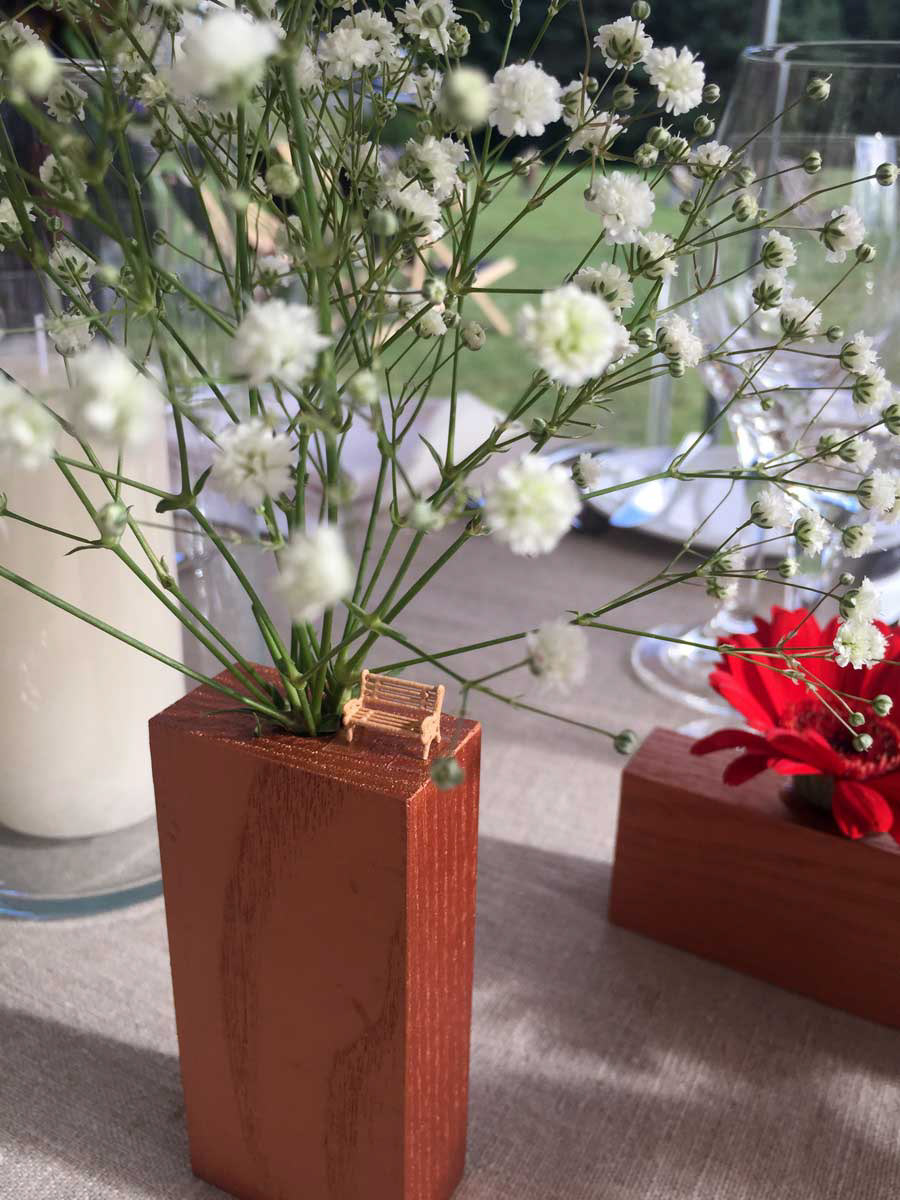 Referring to the local wooden architecture, we made veneer chandeliers and combined them with a spruce branches. Elements of evergreen forest, placed in a copper pleated wooden blocks, created a playful „forest estate”. Tablecloth was hand painted to obtain mountain landscape visual effect.